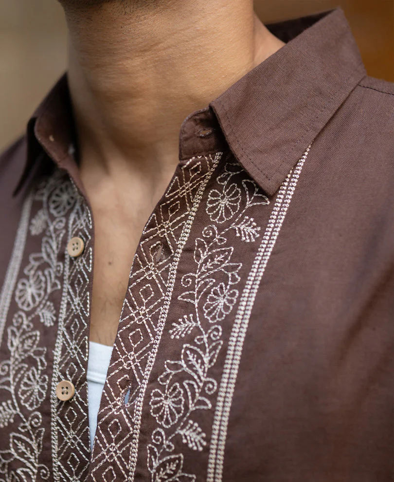 Dark Brown Linen Blend Embroidery Shirt