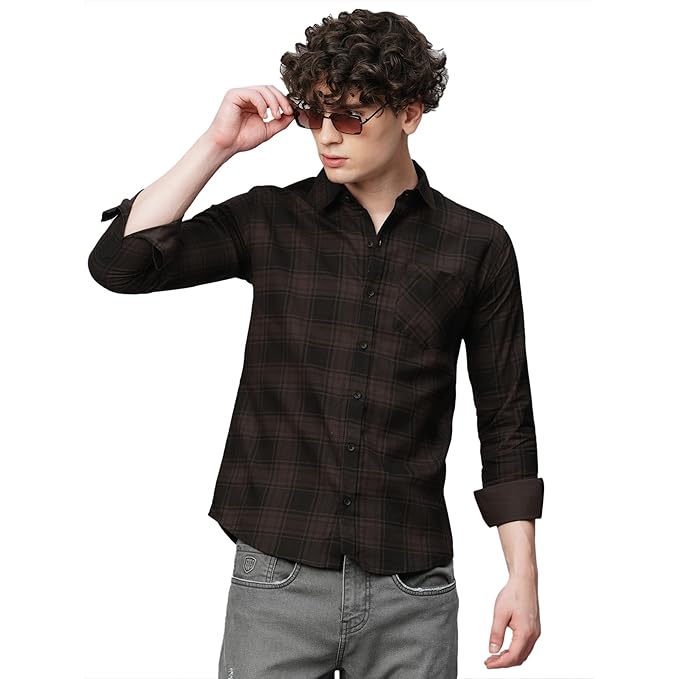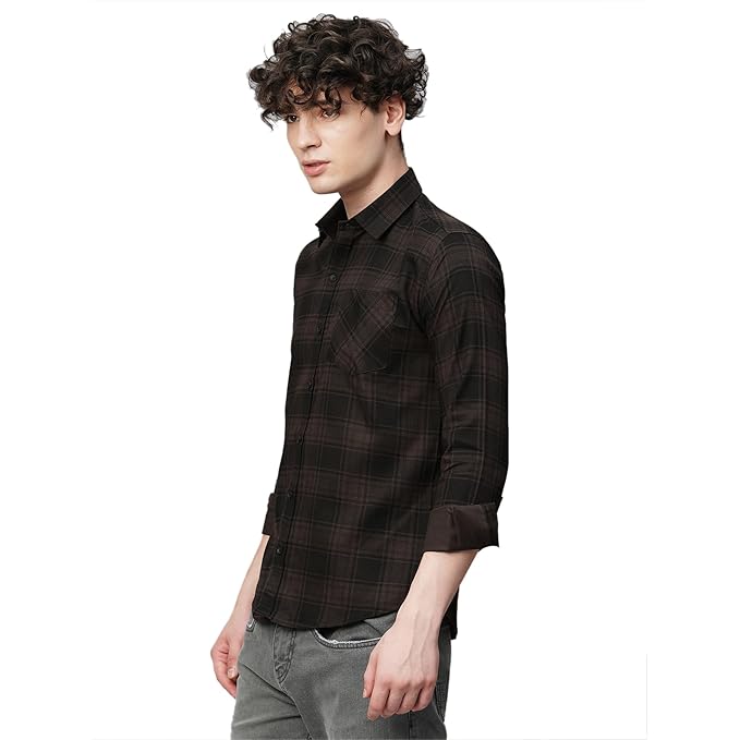 Step up your style game with this sleek dark brown checkered slim fit shirt, crafted for a sharp and modern look. The subtle check pattern combined with deep tones gives it a bold yet refined appeal, perfect for both casual and evening wear.