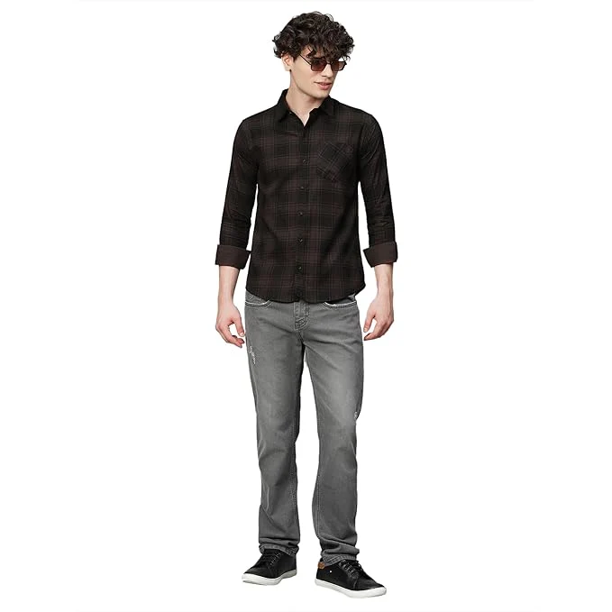 ?? Men?s Dark Brown Checkered Slim Fit Shirt