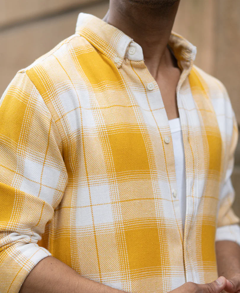 Showcasing a bold grid pattern in sunlit yellow and off-white, this shirt is designed in a soft brushed cotton fabric for comfort and structure. The button-down collar and full sleeves add a refined touch, while the check pattern lends it a versatile casual appeal. Style it with denim or chinos for a vibrant everyday look.